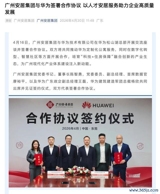 IT之家 4 月 20 日消息,广州安居集团今日公布,4 月 16 日,广州安居集团与华为技术有限公司在华为松山湖总部开展交流座谈并签署合作协议。双方将共同推动华为定制化公寓服务,同时在数字化转型、智慧社区等方面开展合作。
